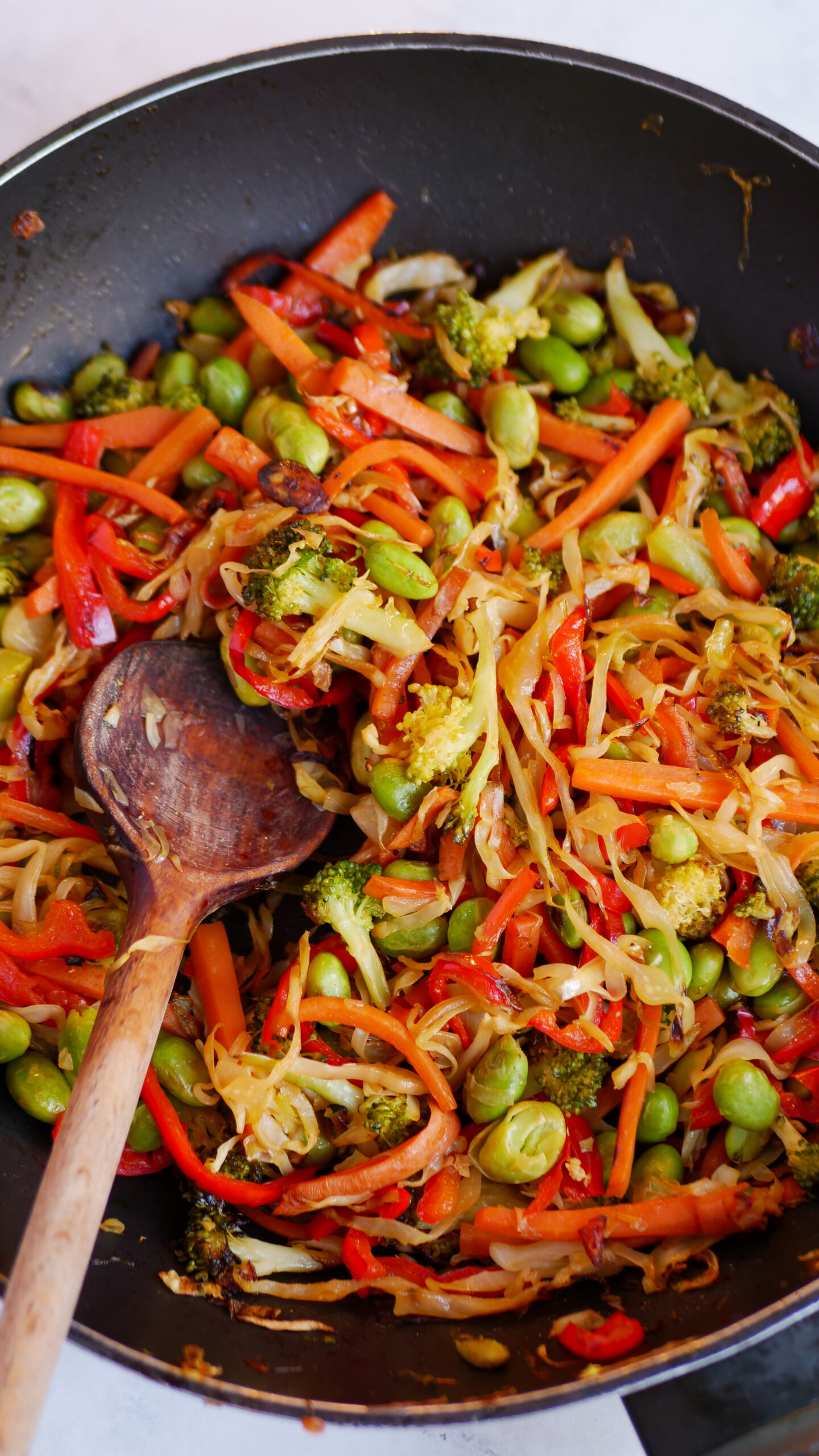 - Gib die vorbereiteten Reisnudeln und das gebratene Gemüse in die Sauce.