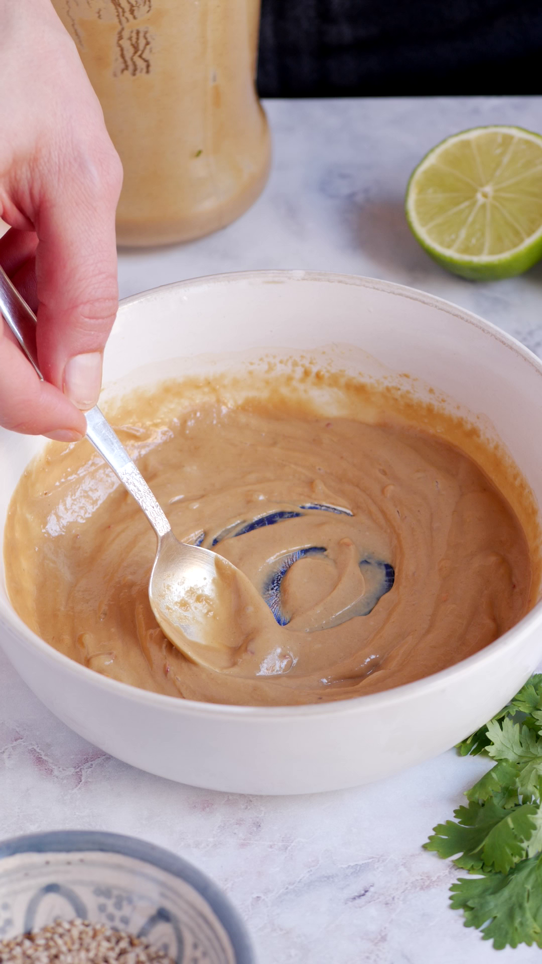- Vermische für die Sauce in einer Schüssel: Erdnussmus, Limettensaft, Sojasoße und Chili.