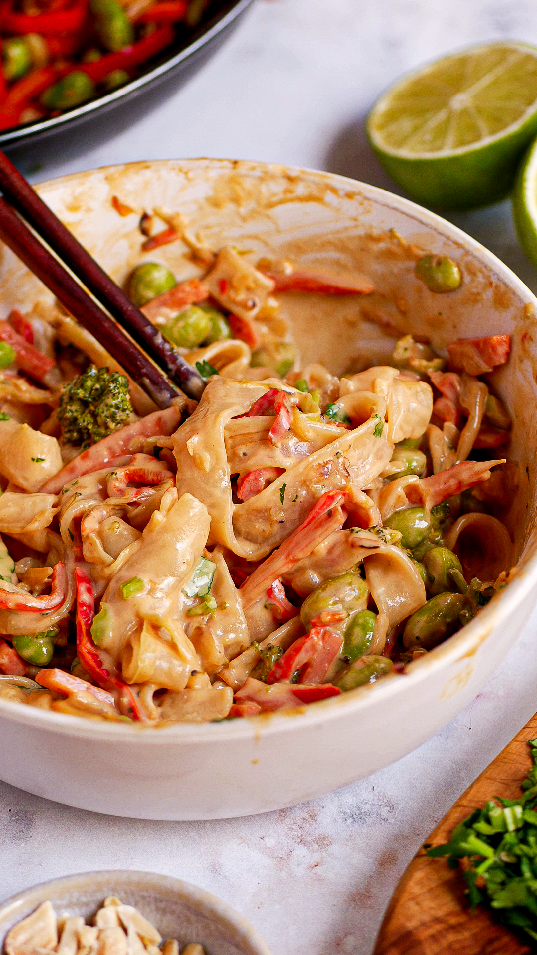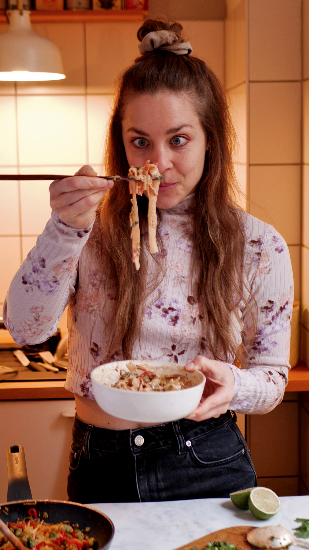 - Bereite die Reisnudeln nach Packungsanleitung zu. Ich nehme am liebsten so richtig breite Reisbandnudeln.