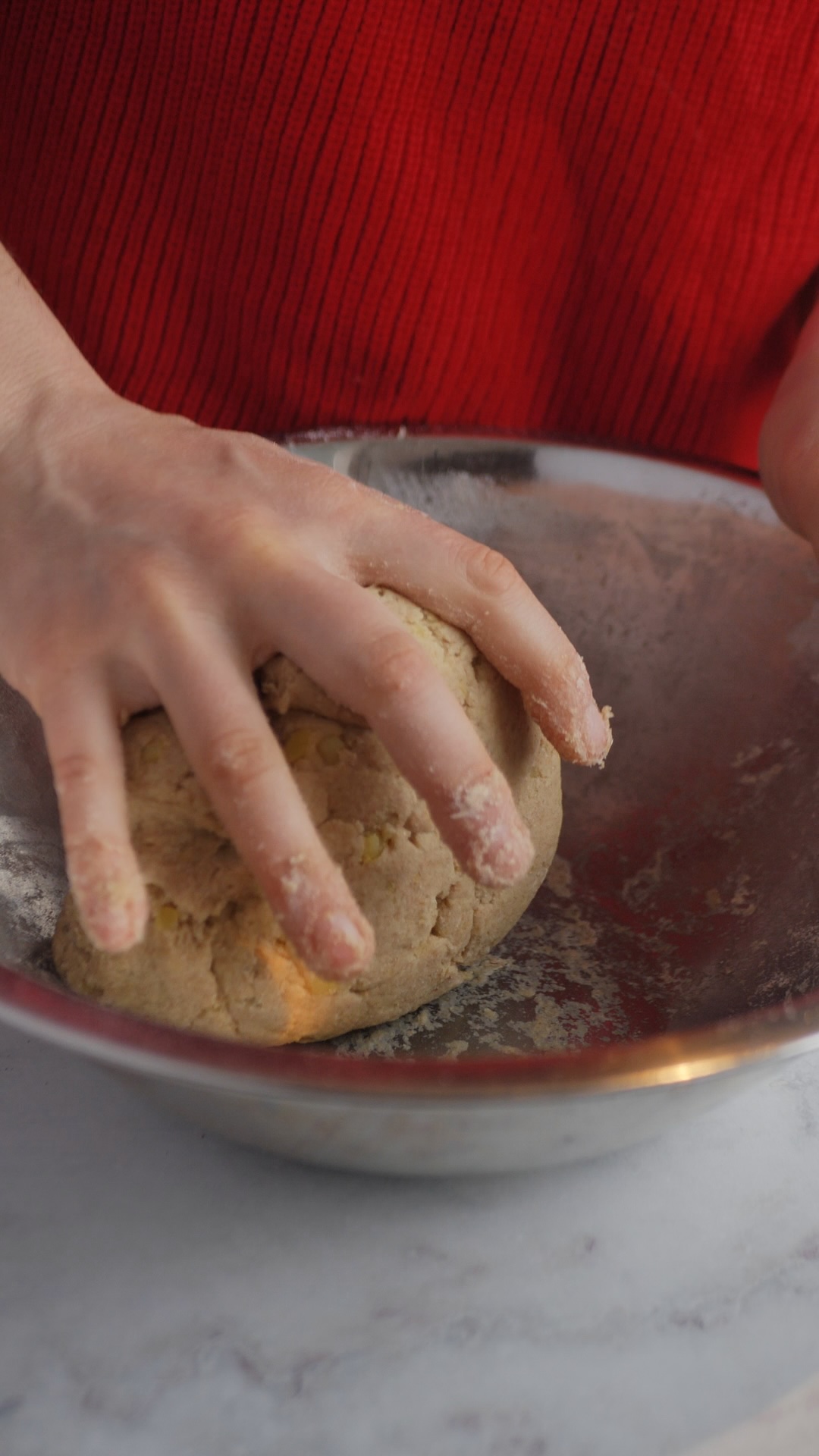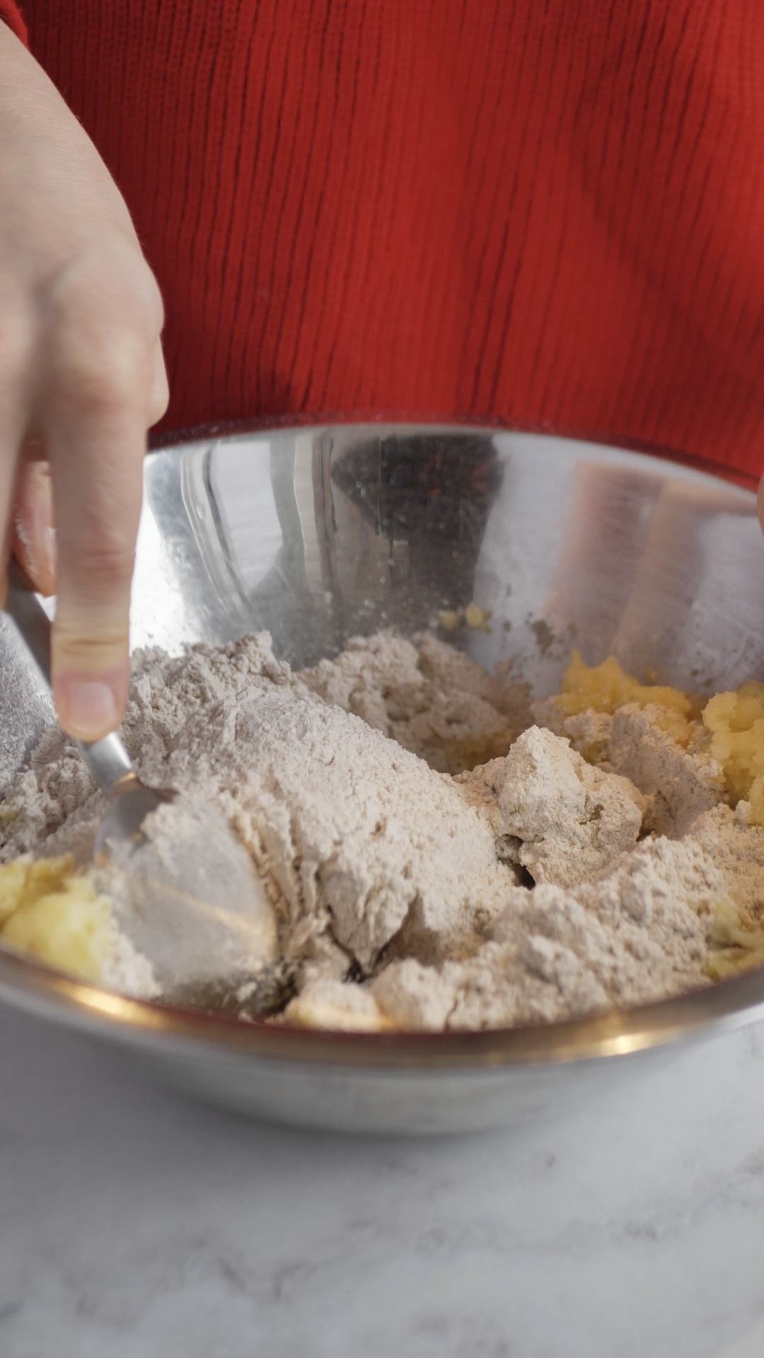 - Gib Mehl und Salz dazu und knete alles gut, bis ein gleichmäßiger Teig ohne Klümpchen entsteht.