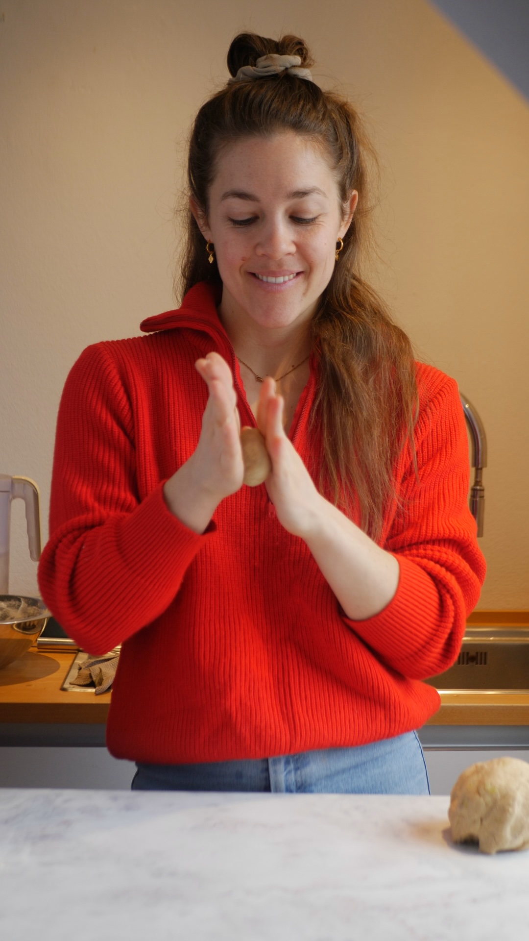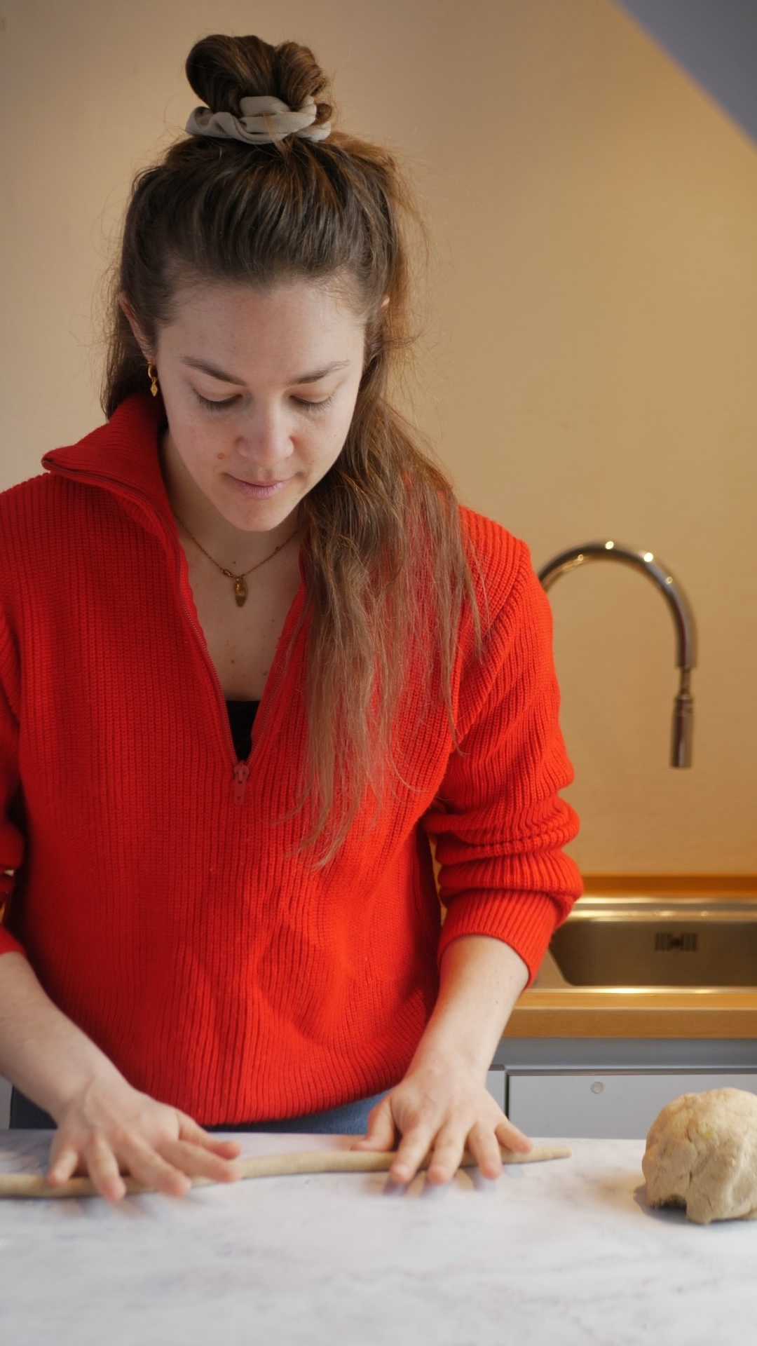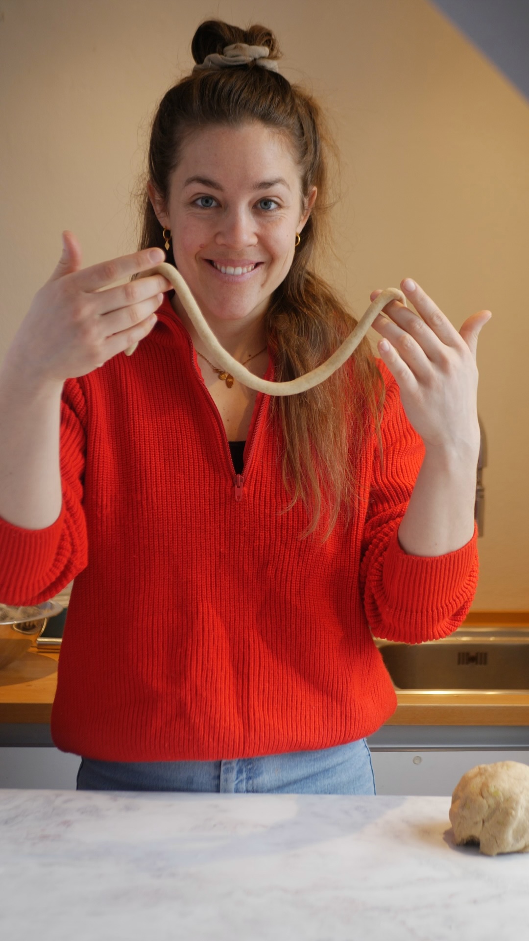 - Rolle den Teig zu kleinen Kugeln und forme sie dann zu langen Nudeln.