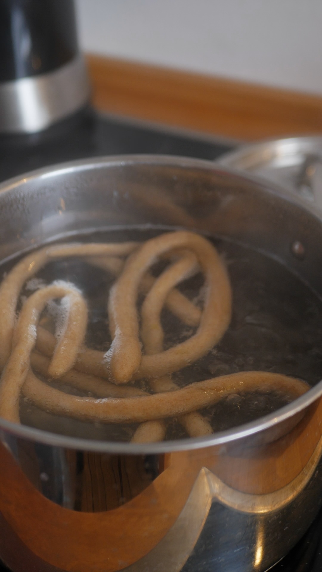 - Koche die Nudeln in Wasser, bis sie an die Oberfläche steigen - dann sind sie fertig. Diese Nudeln sind ähnlich wie Gnocchi und schön soft in der Konsistenz.