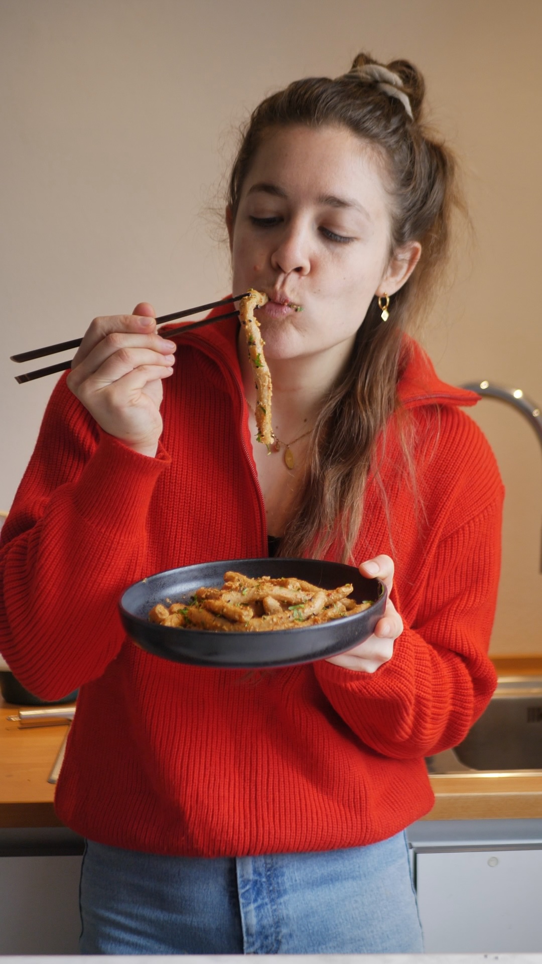 - Erhitze etwas Öl in einer Pfanne, gib die Nudeln und die Sauce dazu und schwenke alles kurz, bis die Nudeln von der Sauce umhüllt sind.